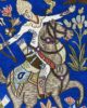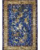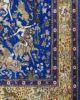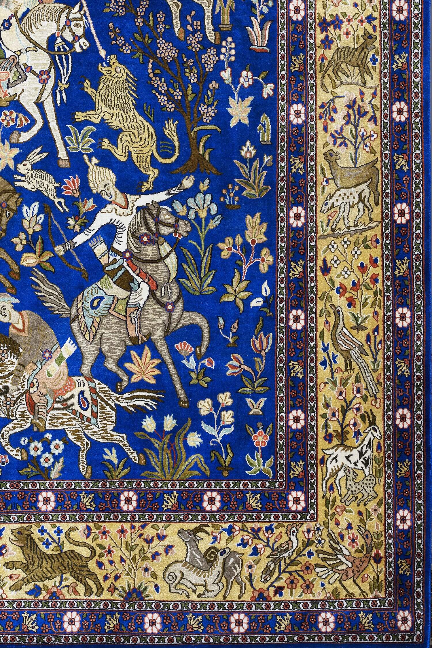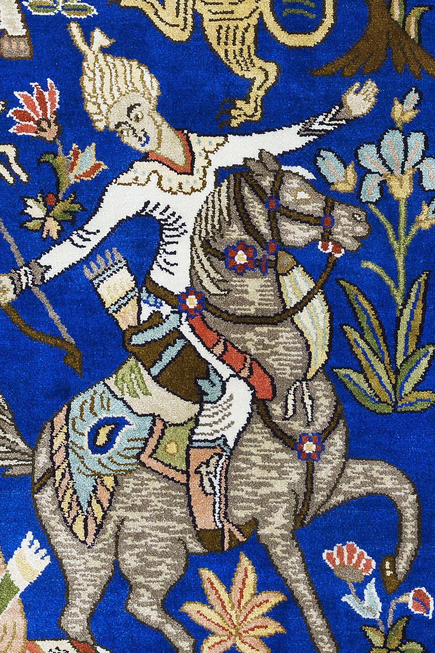 detail. This figurative carpet depicts a formal hunting scene woven on a bed of blue. The borders are composed of an intricate floral design.